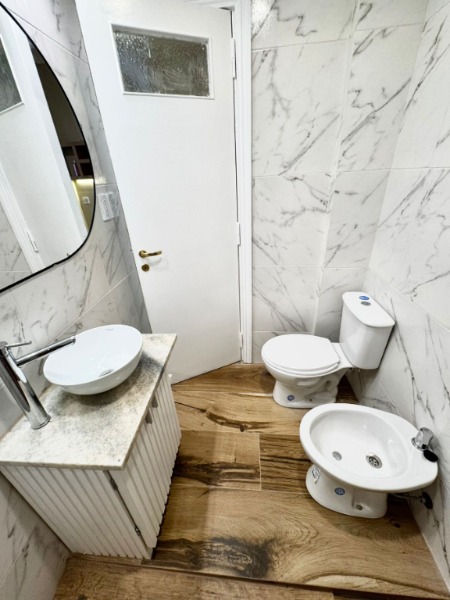 El baño acompaña el nivel del resto del departamento, con mampara y espacio para lavarropas, sumando practicidad a la vida cotidiana.